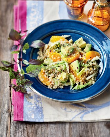 Zuerst die Orangen und den Stangensellerie unter den nur mehr lauwarmen Quinoa heben, dann das Dressing dazu und gut durchmischen. Am Schluss die Avocados vorsichtig unterheben.