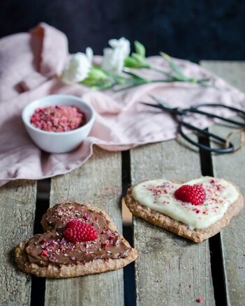Das Joghurt bzw. den Schokoaufstrich auf den Haferflocken verteilen und mit der Himbeere und der Alles Liebe Gewürzblütenmischung bestreuen.