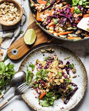 Nach Belieben abschmecken und Tamari, Limettensaft sowie Reisessig unterheben. Abschließend mit Erdnüssen, frisch gehackten Kräutern und Sesamkörnern garnieren. In der Pfanne servieren.