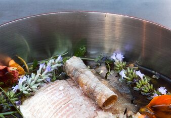 Das Olivenöl mit dem Zitronenpfeffer vermischen und den Bärlauch damit marinieren.