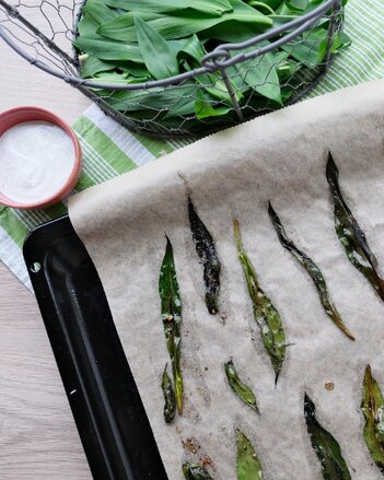 Bärlauch auf ein Backpapier auflegen und bei 150 Grad Ober- und Unterhitze für ca. 20 Minuten ins Backrohr geben. Immer wieder nachsehen, damit der Bärlauch nicht zu dunkel wird.