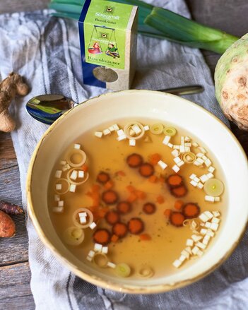 Das ganze ca. 15 Minuten leicht köcheln lassen und anschließend das Gemüse aus der Brühe fischen und die Basenkräuter hinzufügen.