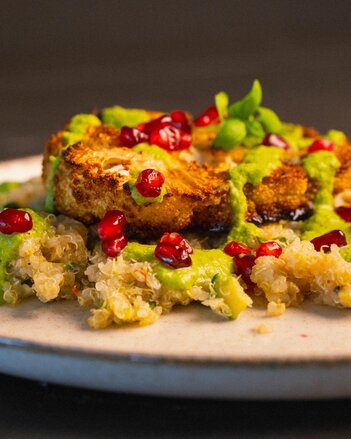 Nun geht’s schon ans Anrichten. Dafür als Erstes den Zucchini-Quinoa auf ein Teller geben und ein heißes Karfiolsteak darauf platzieren. Jetzt noch den Erbsen-Dip aufteilen und mit einer Handvoll frischer Granatapfelkernen bestreuen. Fertig ist euer köstliches veganes, glutenfreies sowie basisches Steak, der etwas anderen Art.