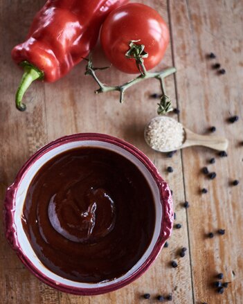 Wer eine besonders glatte Sauce möchte, streicht sie durch ein Passiertuch. In sterilisierte Marmeladengläser füllen und verschließen. Wenn man sauber gearbeitet hat, hält sich die BBQ-Sauce einige Monate!
