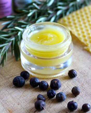 Im ersten Schritt wird ein Ölauszug aus Wacholder und Rosmarin hergestellt. Hierfür den Wacholder im Mörser andrücken, den Rosmarin klein schneiden und gemeinsam mit dem Pflanzenöl in ein verschließbares Glas füllen. Dann das Ganze für 2 Wochen bei Zimmertemperatur ziehen lassen und gelegentlich schütteln. Nach der Ziehzeit durch einen Filter abseihen.