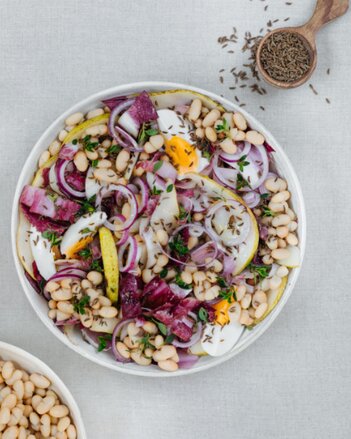 Birnen Bohnen Salat mit Ei und Kümmel-Dressing
