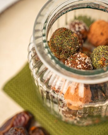 Aus der Masse werden nun kleine Bällchen geformt und entweder in Brennnesselsamen, Kokos oder Rohkakao gewälzt.