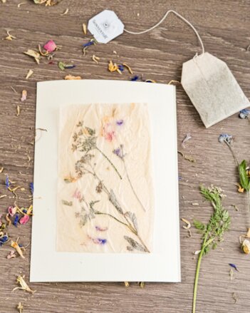 Nun wird eines der Teebeutel Papiere auf eine beschichtete Fläche, zum Beispiel Backpapier, gelegt und die Blüten deiner Wahl aufgelegt. Die Blüten werden vorsichtig mit einer Schicht Bastelkleber bestrichen. Dann wird das zweite Teebeutel-Papier darüber platziert und mit einer weiteren Schicht Kleber befestigt. Das Ganze darf nun einige Stunden trocknen.