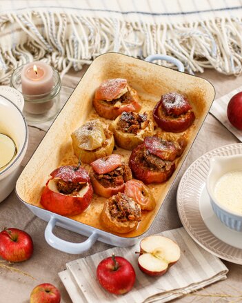 Die heißen Bratäpfel mit der Vanillesauce servieren.