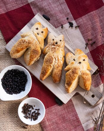 1. Nun geht’s an die Krampusse: Hierfür wird das Teigstück länglich geformt und mit einer Schere eingeschnitten. Einmal unten für die Beine, zweimal an der Seite für die Hände und einmal oben am Kopf, für die Hörner. Anschließend bekommt der Krampus zwei Nelken als Augen und eine Heidelbeere als Mund.