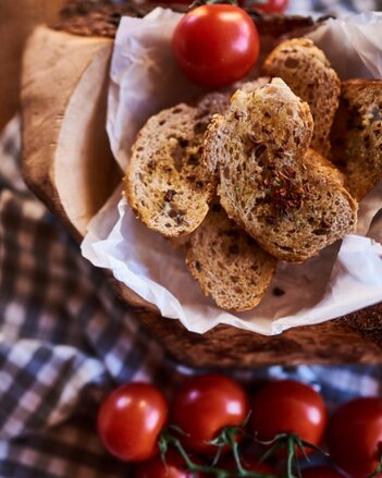 Die Brotscheiben mit Salz und Tomatenflocken bestreuen und bei 100° im Backrohr ca. 15 Minuten rösten.
