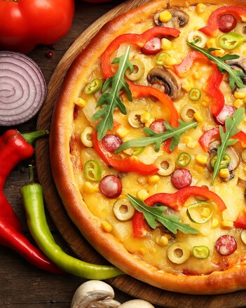 Für den Belag das Gemüse in Streifen bzw. Scheiben schneiden. Anschließend den Teig ausrollen, mit der Tomatensauce bestreichen und mit den anderen Zutaten nach Lust und Laune belegen.