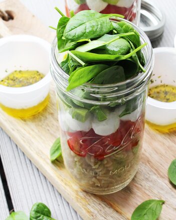 Erst die Kirschtomaten, dann die Mozzarella-Kugeln und die Avocadostücke darüber geben. Als letzte Schicht Blattspinat und Basilikum in die Gläser füllen.