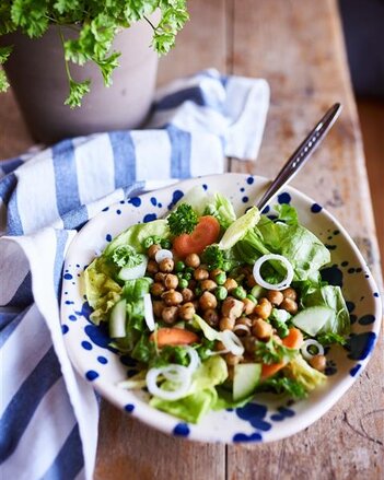 Gemüse und Salat mit Dressing vermischen und die gerösteten Hülsenfrüchte darauf verteilen. Mit frischer Petersilie und Brennnesselsamen garnieren!