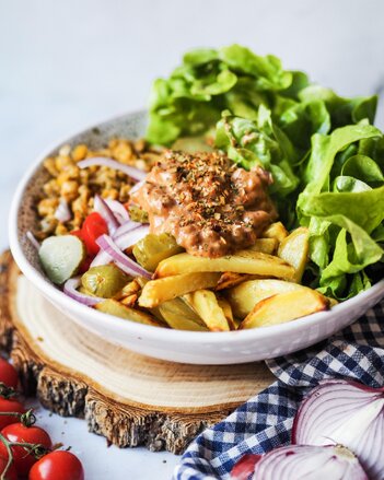 Genieße die köstliche Kombination aus frischen Salat-Zutaten in dieser Burger-Bowl-Kreation.