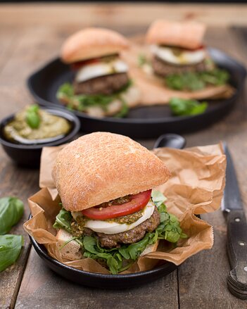 Das Ciabatta mit etwas Petersilienpesto bestreichen, mit den Tomatenscheiben belegen. Die Burger Patties obenauf legen. Die Mozzarella Bällchen auf die heißen Burger geben. Mit etwas Rucola garniert servieren.