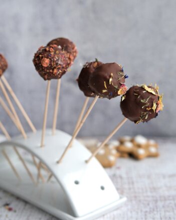 Schmelze das Kokosöl gemeinsam mit der Schokolade über einem Wasserbad und tauche die Cake Pops ein. Lasse die überschüssige Schokolade abtropfen und dekoriere die Cake Pops mit Pyramidensalz oder Gewürzblüten deiner Wahl.