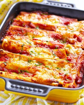 Dann die Cannelloni befüllen und in eine befettete Auflaufform dicht aneinanderschlichten. Für den Überguss die Tomatenpassata mit einer Prise Zucker und Blütenzaubersalz würzen und über die Cannelloni gießen.