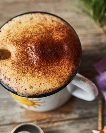 Mit aufgeschäumtem Kakao und einer Prise Zimt anrichten.