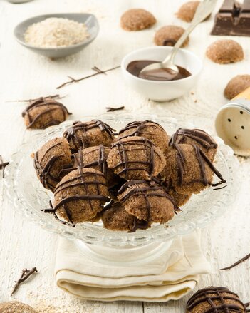 Teig aus der Folie nehmen und die Rolle in ½ cm große Stücke schneiden. Mit den Händen zu Kugeln formen, im Zuckergemisch wälzen und auf ein mit Backpapier ausgelegtes Backblech setzen. Im vorgeheizten Backrohr bei 100 Grad zirka 40 Minuten trocknen lassen. Die Hälfte davon auf ein Backpapier auflegen und mit flüssiger Schokoladenkuvertüre dekorieren.
