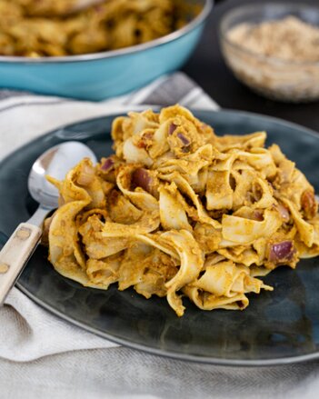 Die fertige Sauce mit den Nudeln vermischen, mit Salz und Pfeffer abschmecken und genießen!
