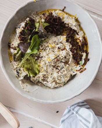 Aufstrich in einer Schüssel mit den restlichen Pilzen, etwas Pflücksalat und einem Schuss Olivenöl anrichten. Mit Brotchips genießen.