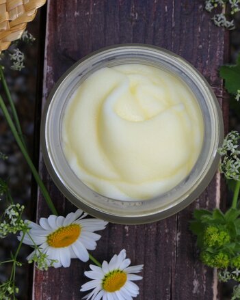 1. Abschließend die ätherischen Öle einrühren und in Glastiegel füllen.