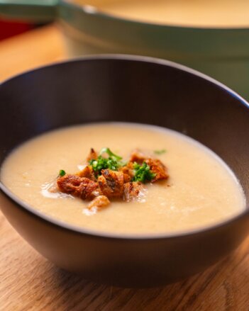 Tipp: Als Suppeneinlage empfehlen wir altbackenes Brot in kleine Würfel geschnitten und in der Pfanne mit etwas Margarine knusprig angebraten. Außerdem passt frische Petersilie wunderbar als grüner Farbtupfer obendrauf.