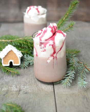 Langsam 1-2 Teelöffel Preiselbeersirup darüber träufeln. Die säuerliche Preiselbeere passt hervorragend zu dem cremig-schokoladigen Getränk.