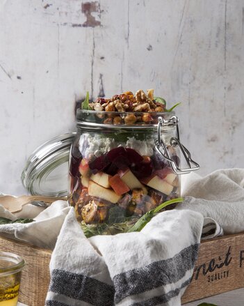 Zutaten in einem großen Weckglas schlichten, mit Walnüssen und gerösteten Kichererbsen abschließen. Vinaigrette kurz vor dem Servieren darüber geben und genießen.