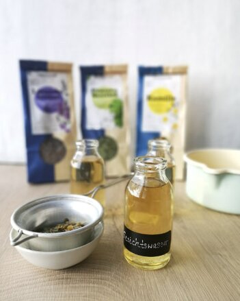 Für längere Haltbarkeit füge nach dem Abgießen 100ml Alkohol (40%) hinzu, rühre gut um und fülle das fertige Gesichtswasser in dunkle Fläschchen.