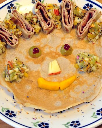 mit Flower Power-Obstsalat. Das bunte Palatschinkengesicht ist fast zu schade um gegessen zu werden!