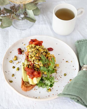 Sauerteigbrotscheiben toasten. Avocado schälen, in Scheiben schneiden, salzen und auf das getoastete Brot geben. Bohneneintopf sowie Eierspeise darauf geben und mit Glücks Gewürz und Koriander garnieren. Mit etwas Olivenöl beträufelt servieren.