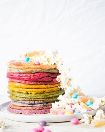Zum Anrichten dann einfach die hübschen, bunten Pancakes übereinander stapeln und nach Belieben toppen; zum Beispiel mit Popcorn, Ahornsirup oder Schokoladensosse