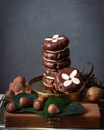 Die Schokolade über dem Wasserbad schmelzen und die Lebkuchen damit bepinseln. Wer möchte, kann geschälte Mandeln darauf dekorieren. Die Lebkuchen halten sich luftdicht gelagert mehrere Wochen.