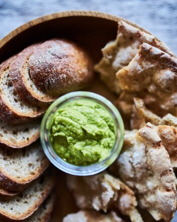 Den Erbsenaufstrich nun mit Schutzengelgewürz, Salz und Pfeffer würzen.