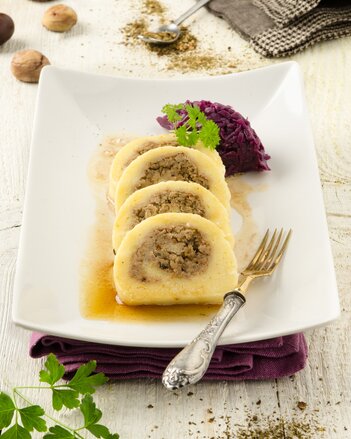 Maronirolle schneiden und in Butter anbraten. Mit dem Rotkraut servieren!