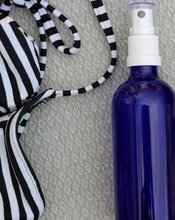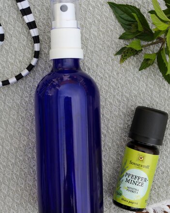 Das Sprühfläschchen bodendeckend mit Alkohol und 10 Tropfen ätherischem Pfefferminzöl befüllen. Der Rest wird mit Pfefferminzhydrolat aufgefüllt.