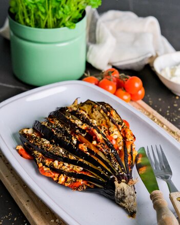 Die Melanzani wie einen Fächer einschneiden und auseinanderziehen.