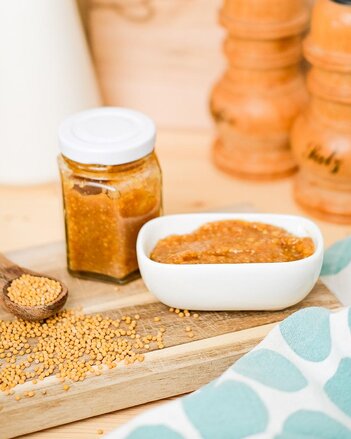 Der Feigen-Senf ist ein einem Glas abgefüllt und befindet sich ebenso in einem weißen länglichen Schüsserl daneben. Außerdem ist ein Holzlöffel mit Senfkörnern zu sehen, welche auch dazwischen lose verteilt sind.  | © SONNENTOR