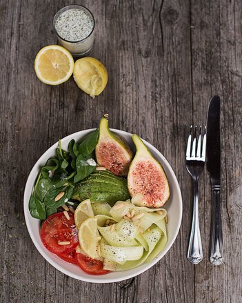 Die Feigen vierteln und den Radicchio in Streifen schneiden. Die Gurke halbieren und in Scheiben schneiden.