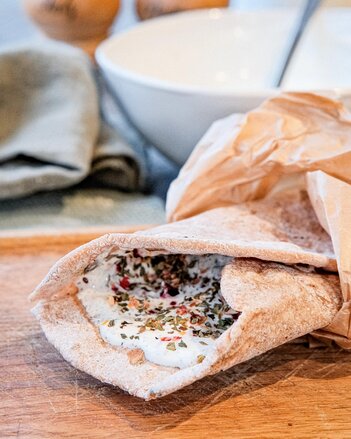 Abschließend die Sauce auf den Fladen geben, mit Glücksgewürz bestreuen und wie einen Wrap zusammenlegen.