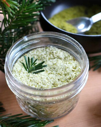 Das Fichtennadelsalz ist für 1 Jahr haltbar und eigent sich hervorragend für Braten- und Grillgerichte oder Salatdressings.