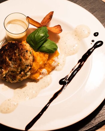 Alle Zutaten vermischen. Sehr gut durchrühren und für mehrere Stunden im Kühlschrank durchziehen lassen. Die Pflanzerl auf dem Süßkartoffelpüree anrichten und mit dem Joghurtdip garnieren.