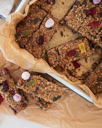 Etwas abkühlen lassen, in 12 Riegel schneiden und mit den Früchtchen als kleine Überraschung bestreuen.