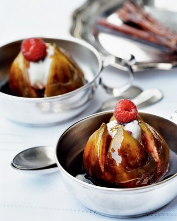 Die Feigen kreuzweise einschneiden, mit Honig beträufeln und im Süßwein mit Zimtstange stehend ca. 5 Minuten köcheln, bis sie kernweich sind.