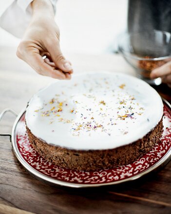Für die Glasur Zutaten zu einer glatten, dickflüssigen Masse verrühren. Flower Power-Gewürz-Blüten-Zubereitung einmengen und die Torte glasieren.
