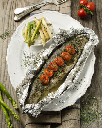 4 Alufolienblätter (ca. 30 x 30 cm) mit Olivenöl bestreichen, die Forelle auflegen, die halbierten Kirschtomaten und je 1 Teelöffel Svens Fischgewürz darauf verteilen. Die Alufolie über der Forelle zusammenfalten, Enden fest verschließen und nebeneinander auf ein Backblech legen.