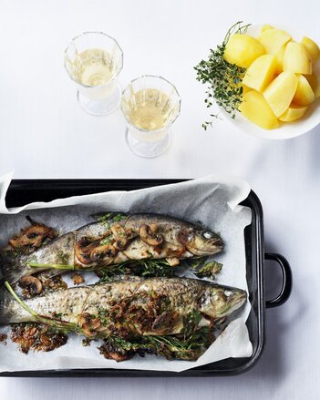 Den Backofen auf 180 °C vorheizen. Die Forellen waschen und trocken tupfen, innen salzen, pfeffern und mit Sven's Fischgewürz innen gut würzen. Mit etwa der Hälfte der Pilzmischung füllen und mit einen Küchengarn zusammenbinden.
