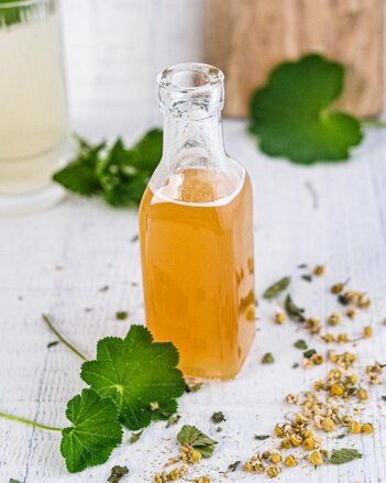 Zaubere dir ganz einfach ein Oxymel mit Kamille, Schafgarbe, Brennnessel und Frauenmantel!